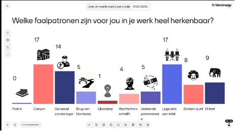 Vanuit het Instituut voor Briljante Mislukkingen maakte duidelijk dat mislukte projecten vaak herkenbare patronen volgen. Archetypen zoals de generaal zonder leger (niet de juiste middelen), de canyon (ingesleten patronen) en de lege plek aan tafel (niet alle relevante partijen zijn betrokken) bleken voor veel deelnemers herkenbaar. Zodra je deze patronen leert zien, kun je er actief op sturen. Risicomanagement is een gezamenlijk leeropgave, waarin verschillende betrokkenen elkaar vinden en met elkaar perspectieven uitwisselen.