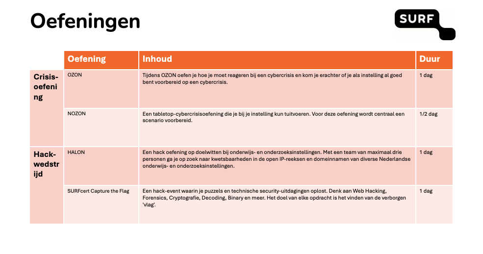 Kennis alleen is niet genoeg — het omzetten van die kennis naar vaardigheden gebeurt via oefenen. Door deze activiteiten regelmatig terug te laten komen, zorgt voor een cultuur waarin medewerkers niet alleen weten wat ze moeten doen, maar het ook effectief kunnen uitvoeren wanneer het telt. Voorbeelden hiervan zijn de tweejaarlijkse sectorbrede cybercrisisoefening OZON en de table-top variant NOZON. Deelname aan OZON en NOZON gaat op instellingsniveau. Bij de hackwedstrijden HALON en SURFcert Capture the Flag oefen je je hackskills. Hiervoor kun je je als team aanmelden of als single player.