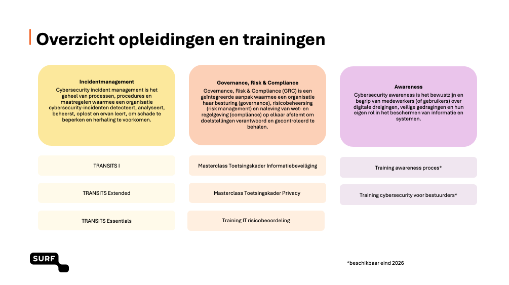 Binnen onderwijs en onderzoek biedt SURF diverse bijeenkomsten op het gebied van cybersecurity en crisismanagement om kennis op te doen (opleiden), vaardigheden aan te leren (trainen) en momenten om deze te oefenen. Deze cyclus zorgt dat het kennisniveau up-to-date blijft in een continu veranderend dreigingslandschap.